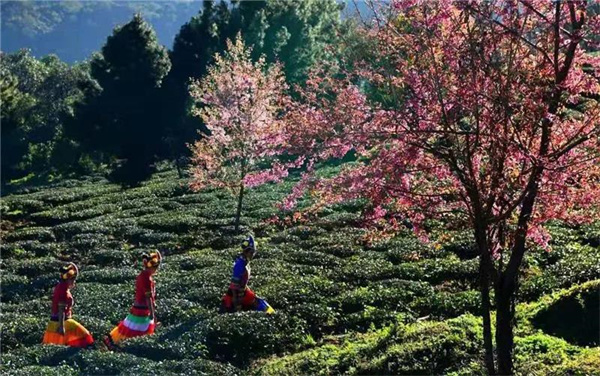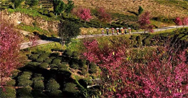 遠(yuǎn)遠(yuǎn)望去,一排排茶樹(shù)像一條條綠色的絲帶,縈繞于山間,一樹(shù)樹(shù)嬌美的粉色櫻花點(diǎn)綴其間,煞是好看。