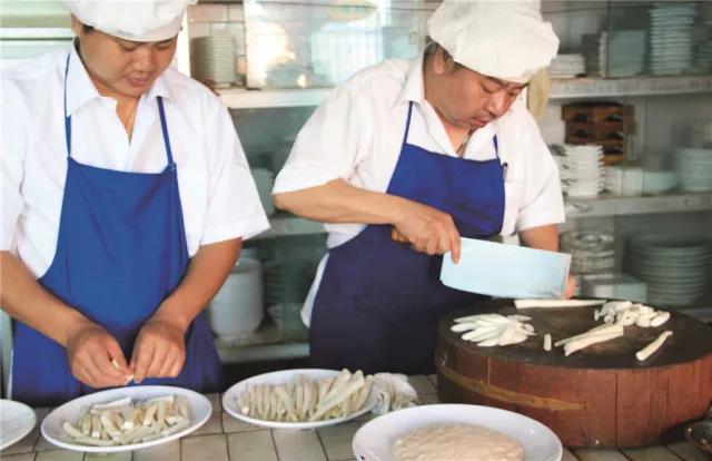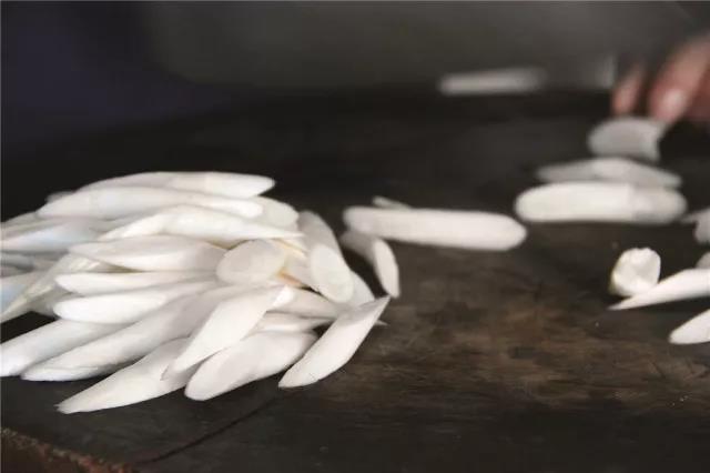 “一般來說,我們認為直直的草芽比較好,長度相當于一掌長。清洗干凈后,把草芽斷成一截一截的,尖的部分不要。”鄭師傅介紹說,所選用的草芽一定要是新鮮的,至于新鮮度,他通常會根據聲音來判斷。說著,便從廚房拿出一段草芽,給我們做示范。“新鮮的草芽,斷成截的時候,發出的聲音是清脆的,放置時間稍長的草芽,折斷時的聲音有點‘皮兒’,根本聽不到清脆聲。”