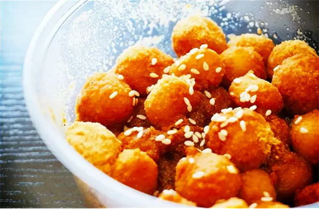 除了鮮花湯圓,豆面湯圓也深受大家喜愛。在湯圓外面滾上一層細膩橙黃的豆面,糯香酥軟,一下就把人帶回兒時最常光顧的湯圓小攤:老板的手柄搖啊搖,一個個白團子懶懶地滾下來,往豆面里一滾,再淋上紅糖和芝麻,那滋味是值得永遠回味的童年。
