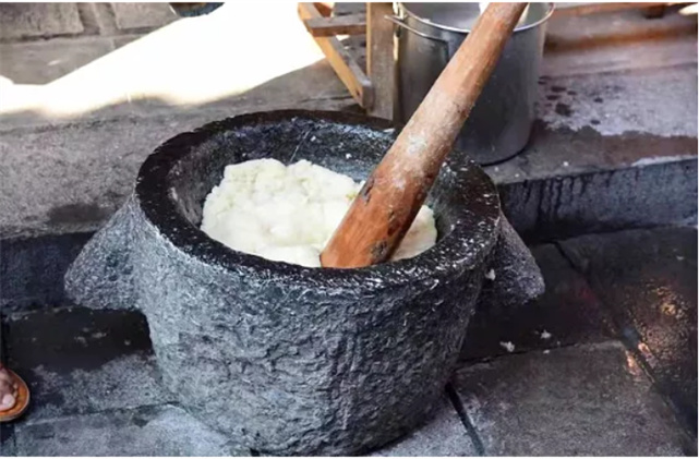 進入臘月,云南很多地方都會有一項重要的年俗活動,蒸糯米、舂糍粑、打糍粑、晾糍粑,當冒著熱氣的糯米飯被放在石碓里,眾人合力用干凈的大木棍把米飯打碎。