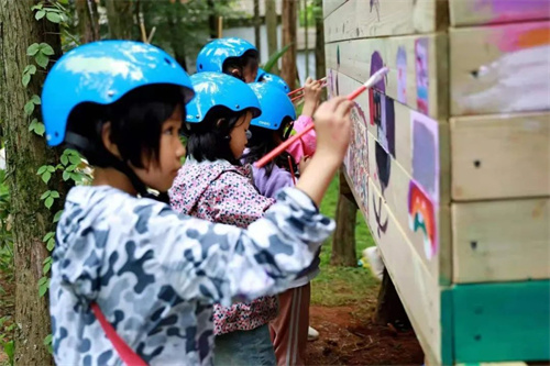 整個木屋是由孩子們一起分工、再合力創造,除了完成自己認領的工程任務之外,還需要合理搭建木制圍欄、屋頂、樹屋裝飾、鳥屋……相互請教、取長補短、互幫互助,這是一個自主溝通的過程。都讓個體與個體之間的連接更加緊密,體驗創造,無疑是對孩子最好的教學。