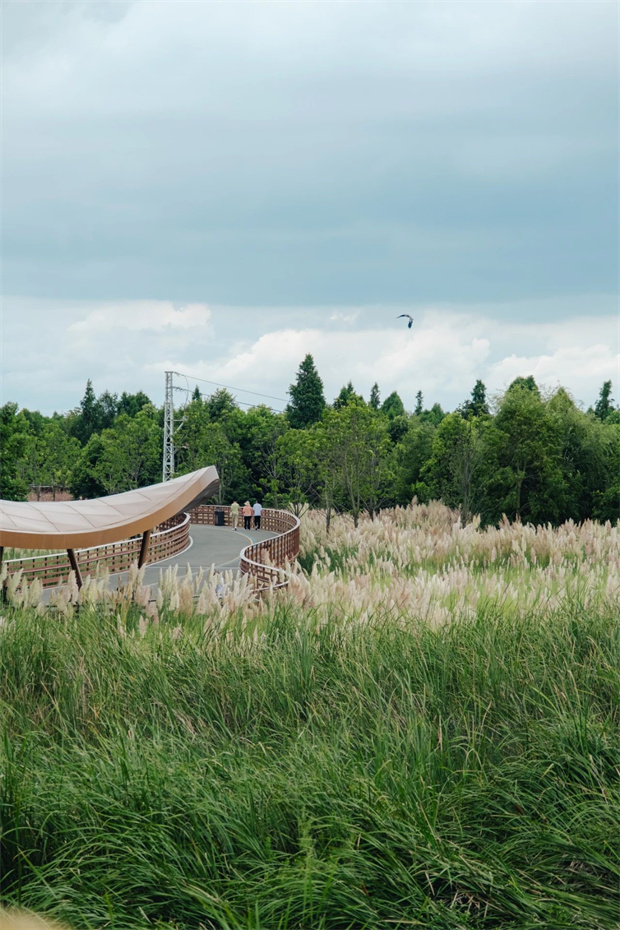 草之橋獨特的"鳥巢"觀景臺如同優雅的雕塑,懸在蒲葦海洋之上。蒲葦花序蓬松如絮,在風里搖曳著細碎的光,與觀景