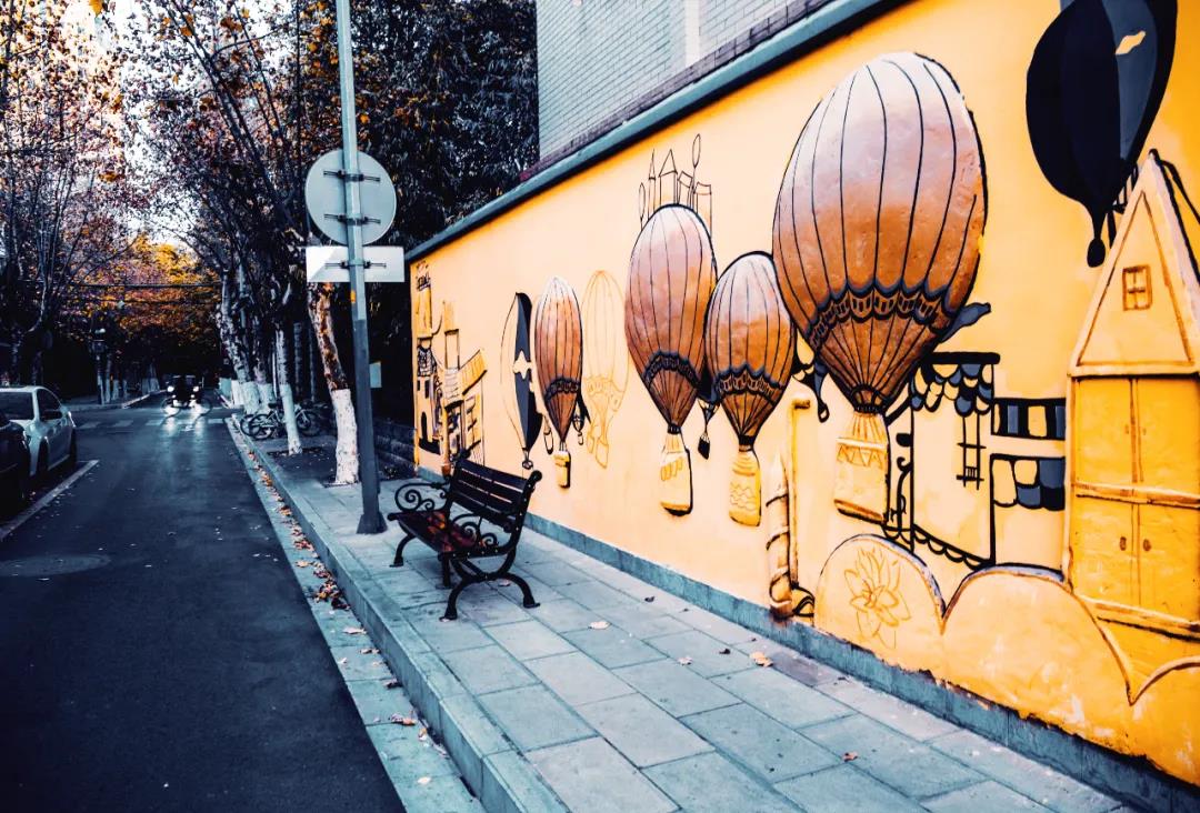 重新修繕的墻面上,被藝術家們畫上了立體生動的彩繪。一面面墻去打卡,體驗熱氣球的浪漫,體驗咖啡推車的趣味,感受老建筑的紋理......這里的每一個巧思設計的元素里都繾綣著老昆明的記憶。