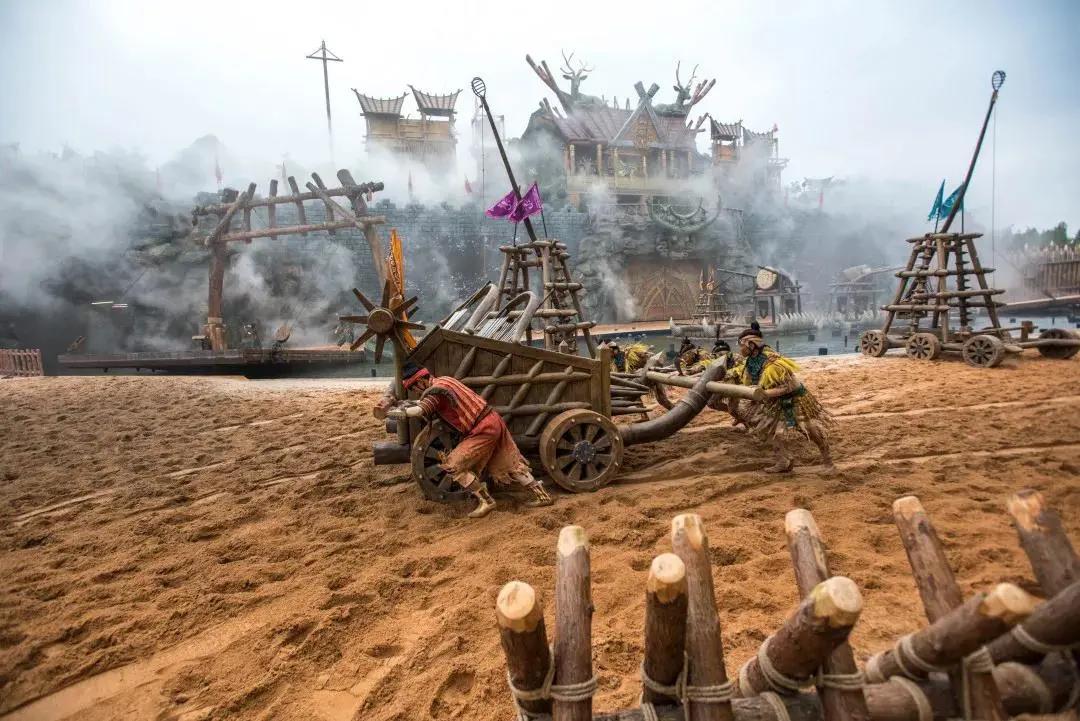 眼前烈馬嘶鳴、士兵沖鋒、滾木擂石、捉對(duì)廝殺。配合相應(yīng)的節(jié)奏,現(xiàn)場還加入了許多煙、火、水、聲的特效,如:現(xiàn)場彌漫的煙塵,兵器撞擊的鏗鏘之聲,從水中突然噴出的火焰,水柱沖天而起,激起的水花有時(shí)還會(huì)濺到前排的觀眾,讓戰(zhàn)爭的場面顯得宏大華美而又驚心動(dòng)魄,具有極強(qiáng)的“帶入感”。