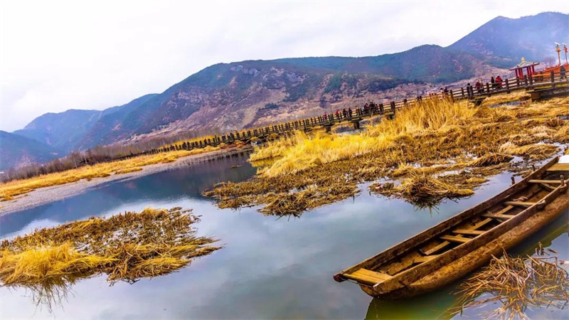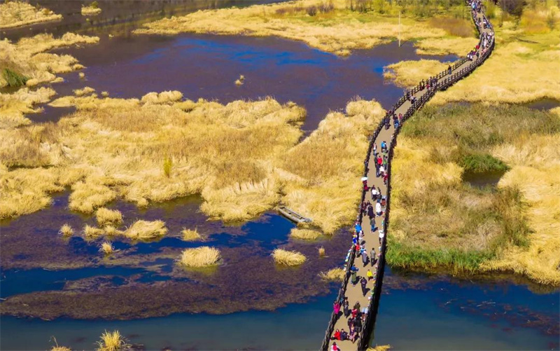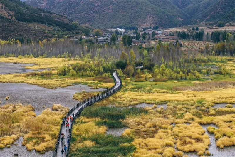 秋天,或許是這里美的季節,枯黃的草海,蕩漾著金色的波濤,從走婚橋上穿過,仿佛穿梭在一個金色的童話。