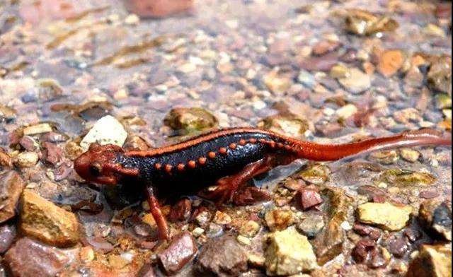紅瘰(luǒ)疣螈,為蠑螈科兩棲動物, 在云南西部分布較廣。雄螈全長136毫米~150毫米,雌螈147毫米~170毫米。紅瘰疣螈頭部平扁,兩側脊棱顯著隆起,無唇褶,好似傳說中的麒麟的角,所以民間又有“金麒麟”之說。它的身體兩側長了瘰粒,一般一側為14~16枚,像極了排列整齊的“乳釘紋”,頗為有趣。身上色彩也頗為鮮艷,背部和體側為棕黑色,而頭部、背脊棱、體側瘰粒、尾部、四肢、肛部周圍均為棕紅色或棕黃色,喜食蚯蚓、蜈蚣、步行蟲、蝸牛等。如果實在喜歡紅瘰疣螈,能買一只或捉一只當寵物養嗎?當然不可以,紅瘰疣螈是國家二級重點保護野生動物,無論是捕捉了用于自養還是用于買賣,都屬違法。