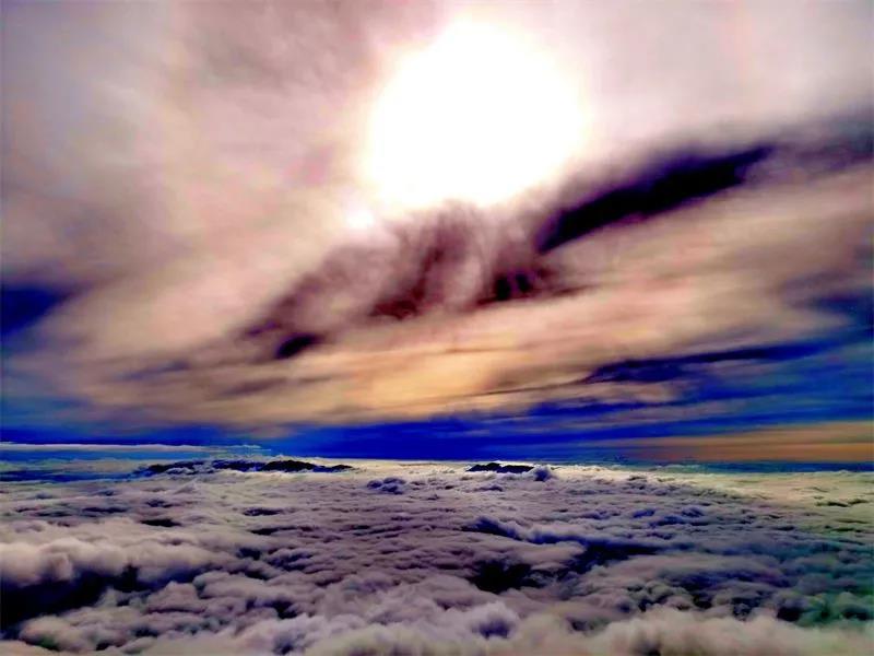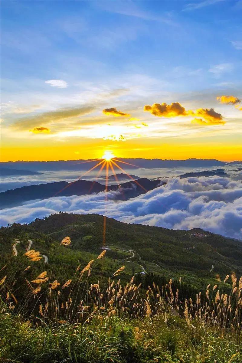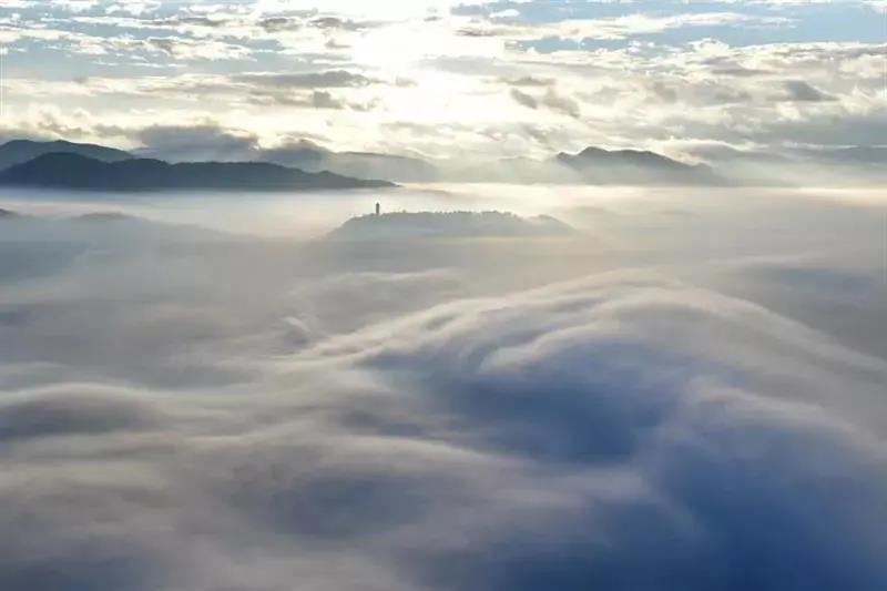 置身大蘆山的茫茫云海,如漫步云端,晨觀朝陽初升,暮賞落日紅霞,似有一只巧手執(zhí)彩筆為遠(yuǎn)處山嵐勾勒出一幅絕美圖景。云海漫涌,群山萬壑隱于云層之下,只有遠(yuǎn)處的山巔隱約可見,如同天際的孤島,在白浪里沉浮翻騰。