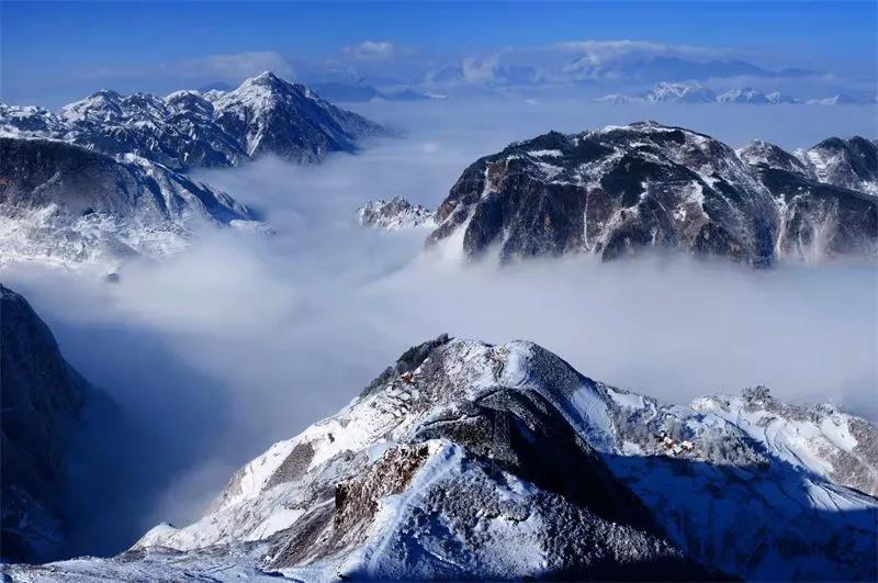 哈巴雪山雄偉壯觀,云海秀麗別致,纏山舞動(dòng),茫茫一片。云霧形成之初,成片狀的云都聚積在山坳里,隨著時(shí)間的推移,云層漸漸加厚,順著山谷緩緩蔓延,時(shí)而爬升,時(shí)而下降,山“海”相約,纏綿悱惻。