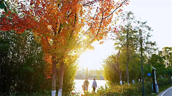 公園里盡是紅、黃、金色浸染,沙灘、湖泊、蘆葦相映,一景一物都如畫卷般美輪美奐。就連公園里的小路,在落葉的點綴下,美得都別有一番風(fēng)韻。