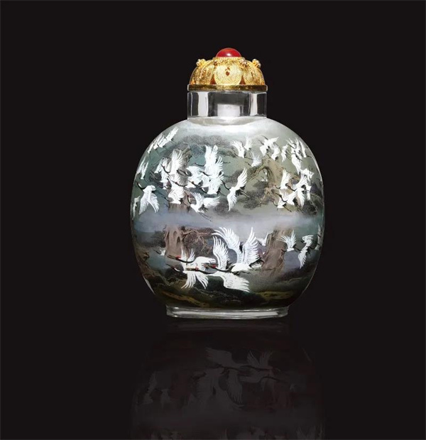 其中,最引人注目的是《百鶴圖》,這也是她最滿意的作品。其主要依托于云南黑頸鶴,以及她對云南少數(shù)民族地域文化的熱愛。從構(gòu)圖到繪畫過程中,全是一氣呵成的,整個(gè)作品完成需要4個(gè)月。她通過內(nèi)畫技藝,將云南的山水盡收瓶中,綻放出奪目光彩。