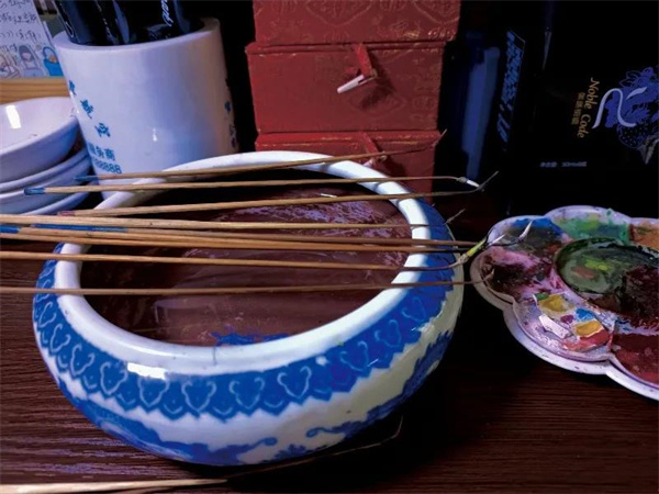 “要學(xué)內(nèi)畫,先得學(xué)做筆”這是孫鴻雁經(jīng)常對她的學(xué)生說的一句話。據(jù)了解,這個(gè)畫筆在傳統(tǒng)內(nèi)畫基礎(chǔ)上改革創(chuàng)新了幾次。傳統(tǒng)筆桿用的是鐵絲,而滇派內(nèi)畫選用的是金竹。新鮮的竹子曬一年半左右,可以保持一定水分又不會太干,彎曲后可以回到原處,如此作出的畫筆,無論從細(xì)度、弧度,還是韌性上,都更適合于在狹小的瓶內(nèi)空間創(chuàng)作,穿梭在狹窄的瓶口,游刃有余。