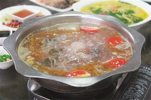 用雞腳和骨頭來打湯,等湯味基本鮮甜了,再兌入發酵好的酸湯,在過程中,二者的比例很重要,比例正好的岜夯雞,酸中帶有鮮甜味,油而不膩。在當地,喜好豐富口味的人,會在岜夯雞中放入包括蒜汁、姜絲、胡椒、辣子、酸筍、醬油等佐料,多達18種,加入佐料后的岜夯雞,風味更足,吃起來口感層次則更加豐富。也有喜好岜夯雞本味的食客,會打一碟蘸水,一鍋一碗,得食兩味。