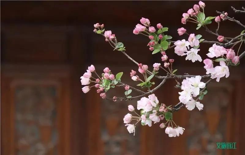 海棠花的美麗從紅艷如胭的花蕾開始,沒有完全綻放的花苞紅潤艷麗,似胭脂點點;綻放后則逐漸變?yōu)榉奂t色,如曉天明霞,軟柔如絹的片片花瓣上泛著陣陣紅暈,仿佛美人腮上勻開的胭脂,嬌羞可人。